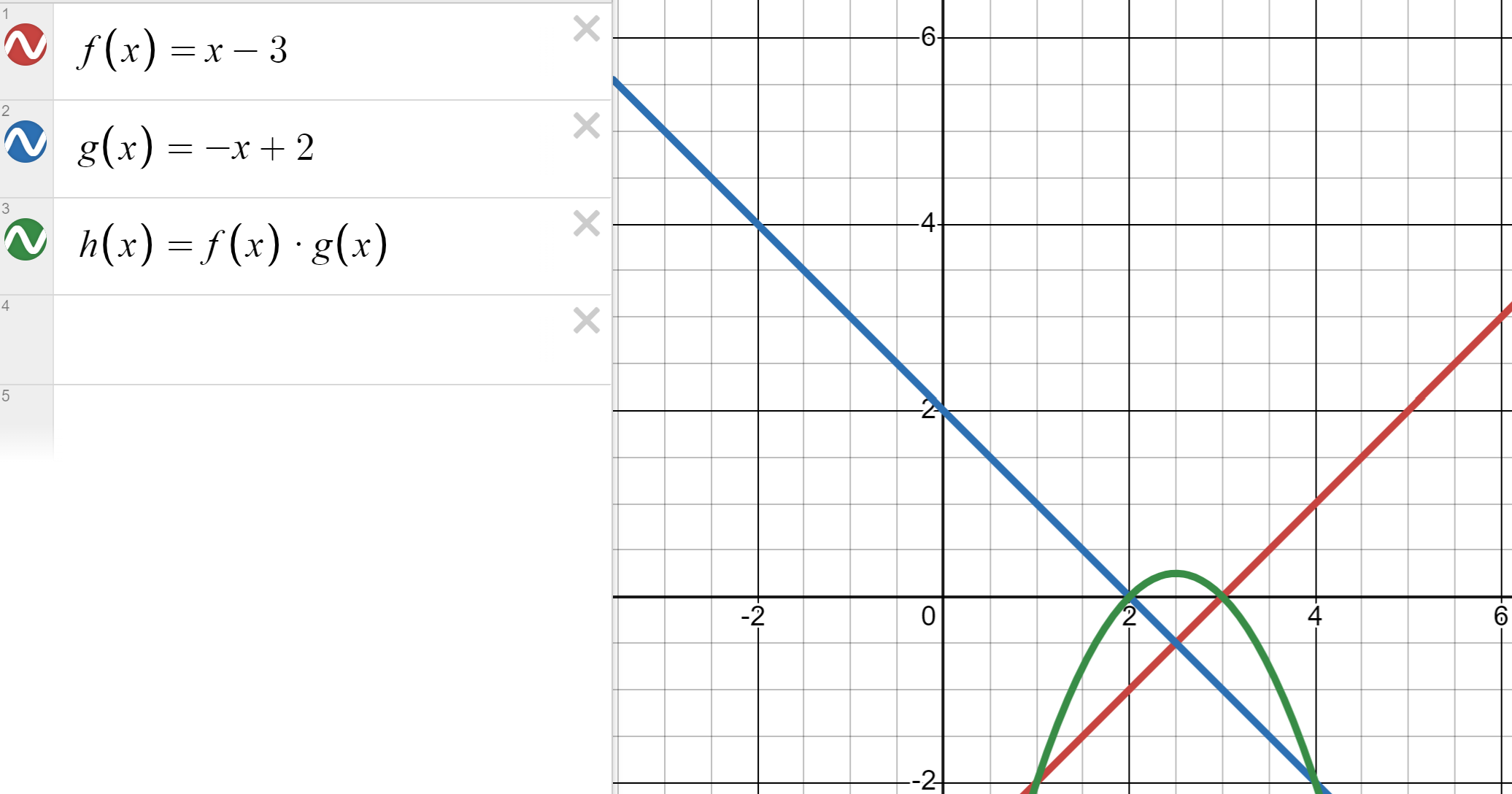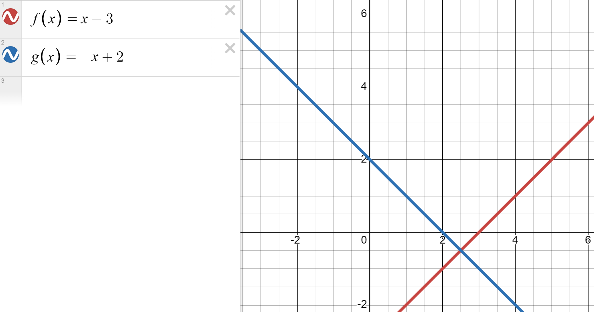 I intentionally wrote the two lines in function notation. We have one line with a negative slope and x-intercept of (2,0) and another line with a positive slope and an x-intercept of (3,0). They have an intercept with each other at (2.5,-0.5).